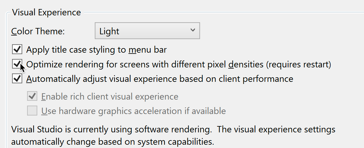 ReSharper Ultimate 2019.2 は Visual Studio 2019 で導入された“Per-Monitor DPI Awareness” モード のサポートを提供します。一部の ReSharper ユーザーは、以前は Optimize rendering for screens with different pixel densities (Tools | Options | Environment | General) 設定を無効にしていました。ReSharper ツールウィンドウでレンダリングの問題があったためです。再度設定を有効にし、うまく動作するか確認してみてください。まだいくつかの問題がある箇所があることにご注意ください。