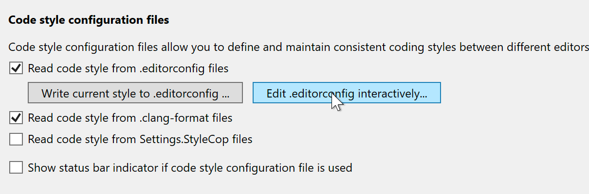 C# 8.0 のサポートを向上するために、switch 式のための新しいフォーマットオプションを追加しました。 .editorconfig, StyleCop.Settings, .clang-format のサポートのパフォーマンスが向上し、ハイライトと Solution Wide Error Analysis がデフォルトでオンになっています。また Option ページの右側で EditorConfig のプロパティを編集できるようになりました。